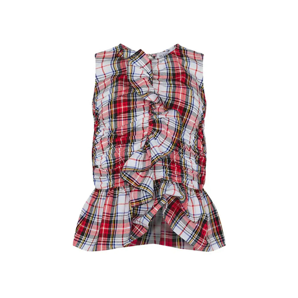 The Doering Top in Carlyle Plaid introduces a fresh, architectural silhouette for the season. Defined by its fitted V-neckline, cascading ruffles, and flattering shirring, this sleeveless design features a peplum waist that creates a sculptural, feminine shape. Rendered in signature Carlyle Plaid, it’s both polished and playful—a true statement piece. Style it with the Dominic Skirt for a bold plaid-on-plaid look, pair it with the Adele Skirt in Red for a festive pop, or ground it with the Ida Skirt in suede for refined contrast.