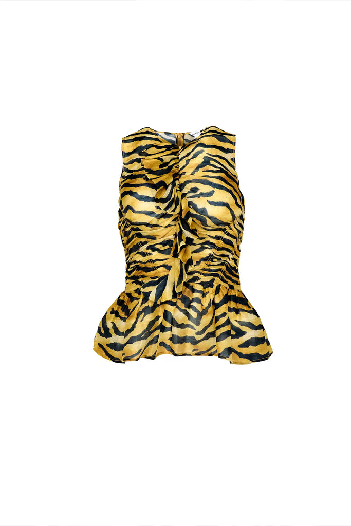 Linen-silk blend in Tiger print. Fitted V-neckline. Cascading ruffles. Shirred detailing. Peplum waist. Sleeveless silhouette. Concealed back zipper. Fully lined.