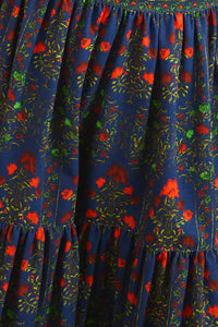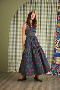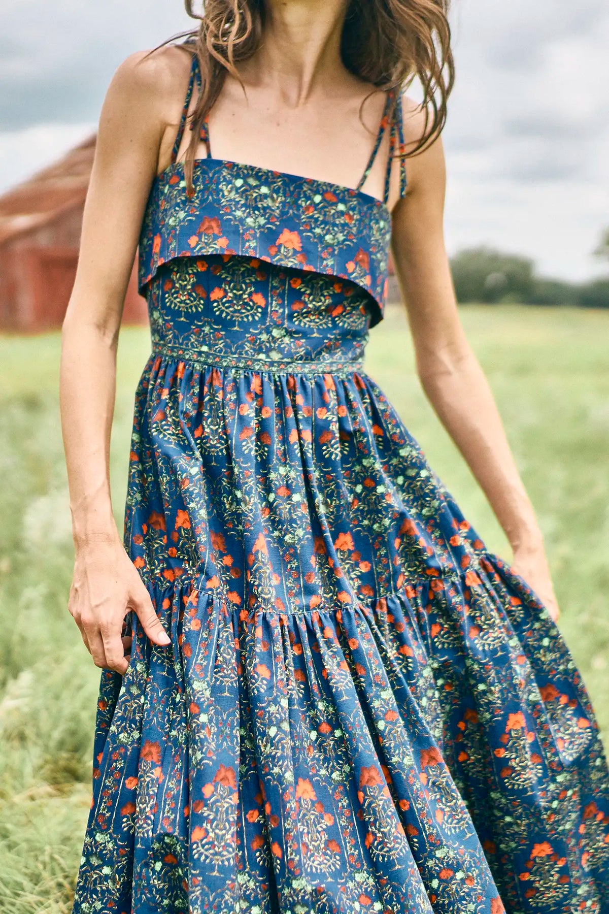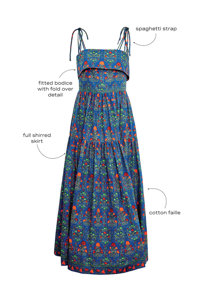 100% cotton. Structured cotton faille. Midnight Garden print. Sculpted bodice with fold-over detail. Spaghetti straps. Cinched waist. Shirred full skirt. Midi length. 52" length from top of shoulder.