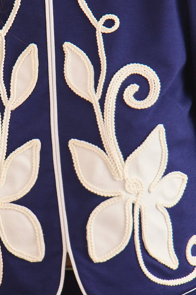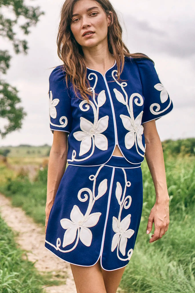 Hunter Bell brings joyful, polished pieces to life with a distinctive mix of bold pattern, thoughtful tailoring, and feminine charm. The Dottie Mini Skirt in Navy blends vintage inspiration with modern ease, designed as a charming complement to the matching Beeson Top. This flattering A-line silhouette features a tulip hem, fitted waist, and back zipper closure, while delicate appliqué details add texture and a handcrafted touch. Whether worn as a set or styled separately, Dottie is a playful standout for fall.