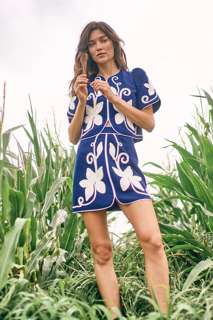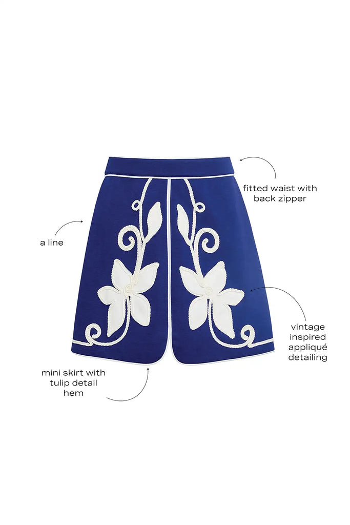 60% poly, 35% rayon, 5% elastane. A-line mini skirt with tulip hem. Back zipper closure. Tonal appliqué detailing. Designed to pair with the Beeson Top. 16" from top of waistband.