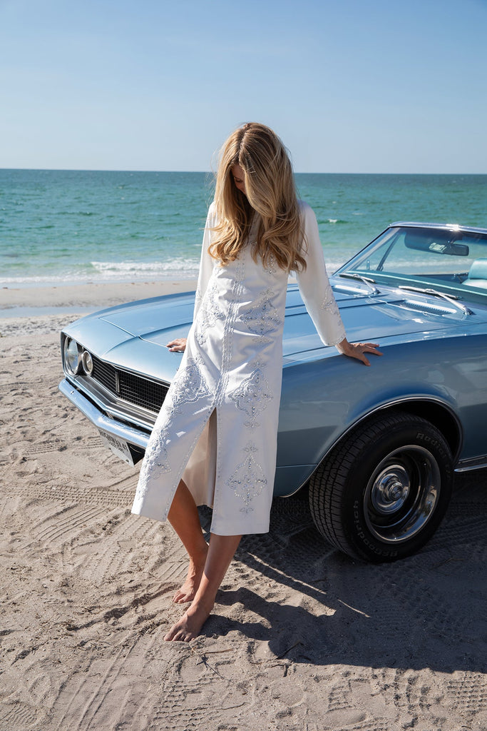 The Dove Beaded Clara Caftan is a fluid, light-filled silhouette that moves with quiet elegance. Crafted from luxurious silk twill, the design features a front slit for subtle ease and graceful flow. Across the surface, pointed clover motifs shimmer with seed beads, cut crystals, diamantés, and teardrop pearls—each one meticulously hand-beaded on a traditional loom by skilled artisans. Inspired by the luminous charm of 1960s island life, this caftan embodies refined sophistication and relaxed glamour.