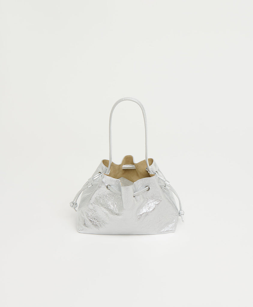 The Drawstring Pouchette in Crinkled Silver brings a luminous touch to a signature silhouette. Crafted from premium Italian leather with a subtly textured metallic finish, this compact pouch holds daily essentials while maintaining an elevated, modern feel. The soft drawstring closure and minimalist design transition effortlessly from day to evening.