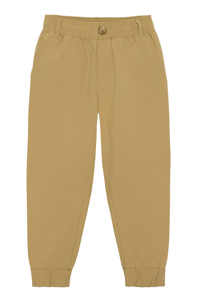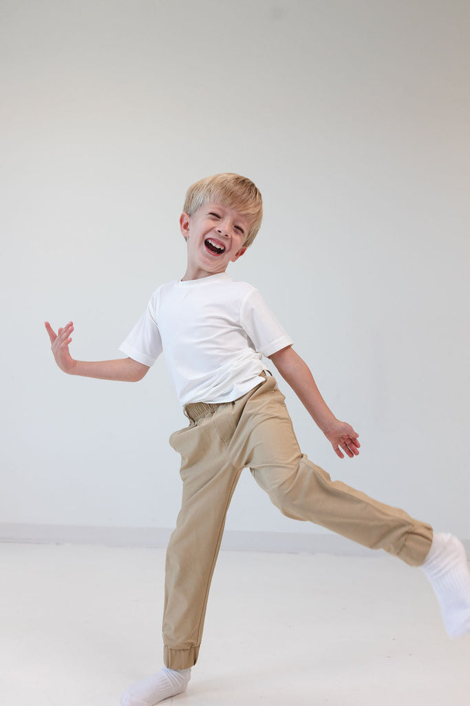 A polished blend of style and sport, Courtside Kids reimagines children’s activewear with performance fabrics, modern tailoring, and a classic athletic sensibility—made for everywhere from the playground to the country club. The Dress Joggers in Khaki bring a refined twist to the brand’s signature jogger silhouette, crafted in the best-selling dress short fabric for a look that’s as polished as it is comfortable. Featuring belt loops, a decorative button, and an easy pull-on waistband, these elevated joggers are designed for sporty boys who prefer ease over formality—making them a stylish alternative to traditional dress pants.