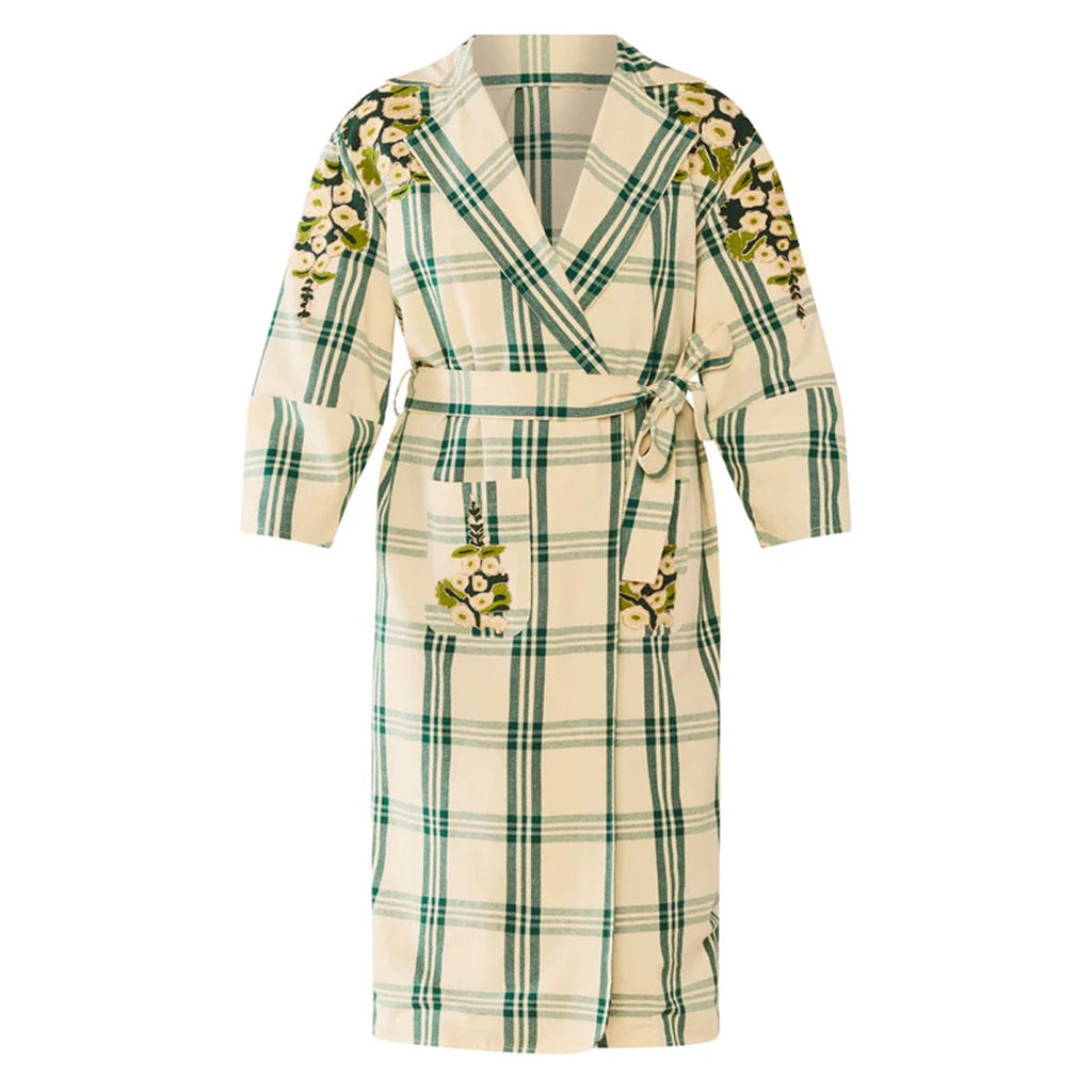 100% BCI cotton. Plaid with floral embroidery. Classic trench silhouette. Belted waist. Lined. Made in India.