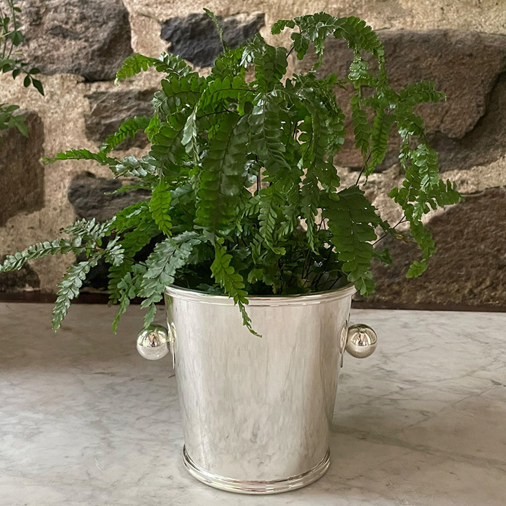 Hôtel Silver is a curated collection of European hotel silver and barware—vintage and new—established in 1988. Known for its casual elegance, the brand’s streamlined design is timeless and effortlessly complements any setting. The Egerton Ice Bucket, handcrafted in London for Hôtel, is a classic bar accessory ideal for assembling drinks at cocktail time. When not in use for entertaining, this handsome bucket doubles as a chic vessel for flowers or a potted plant.