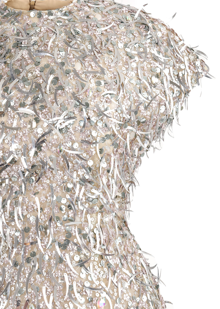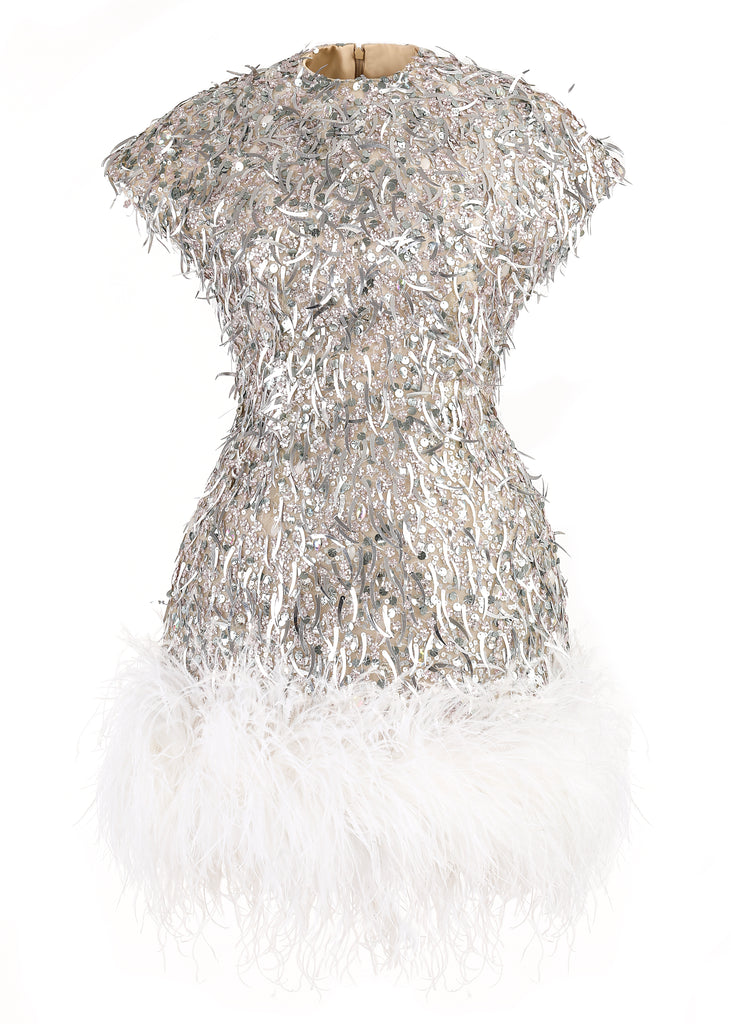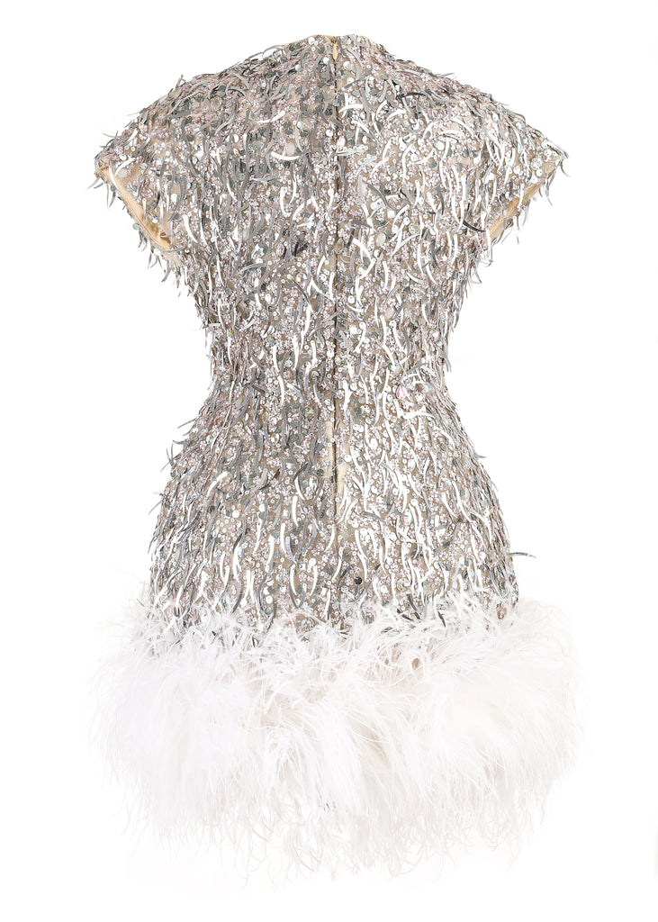 Fully embroidered with metallic fringe and real feathers. Cap sleeves. Sculpted waist. Mini length. Please contact customercare@overthemoon.com if you are interested in scheduling a private fitting in New York City.