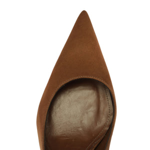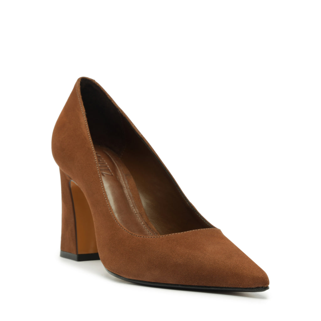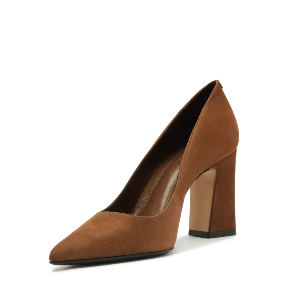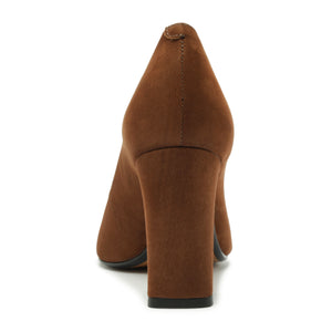 Suede upper. Man-made lining. Man-made sole. Pointed toe. Block heel.