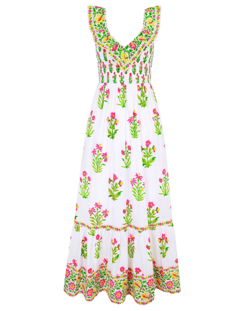 The Electric Meadow Paxos Dress channels easy elegance in a fresh palette of pink, green, and lemon yellow, block-printed by hand in a joyful mix of butas and borders. Designed with a statement V-neckline framed by a delicate border trim, it features a comfortable smocked bodice and an airy, tiered skirt that moves beautifully. A vacation-ready silhouette made for sunlit days and relaxed evenings alike.