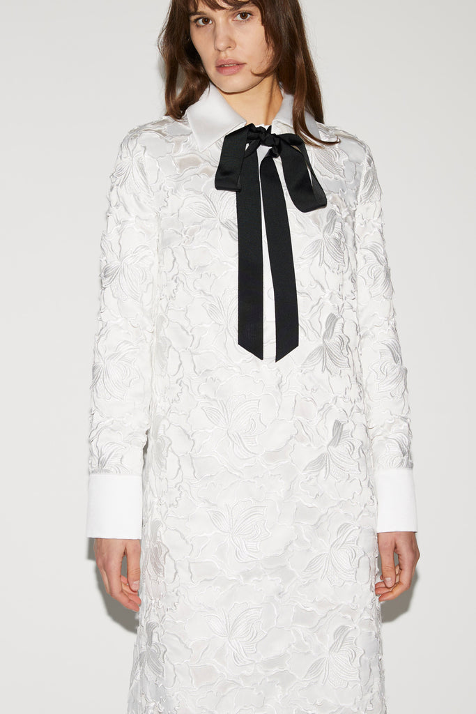 The London-based luxury brand, Huishan Zhang, was launched in 2011. As a Chinese-born designer, Huishan combines his heritage with Western influences to create a sophisticated, signature style. The Elena Gown in White Cutwork Duchesse embodies this refined duality, merging classic couture craftsmanship with contemporary design. Crafted from white duchesse satin adorned with intricate floral cutwork, the gown features a crisp collar, contrast cuffs, and a removable black grosgrain necktie—offering a striking balance of modern polish and timeless femininity.