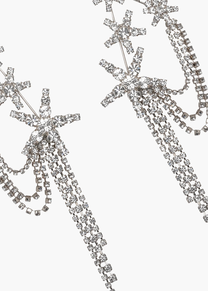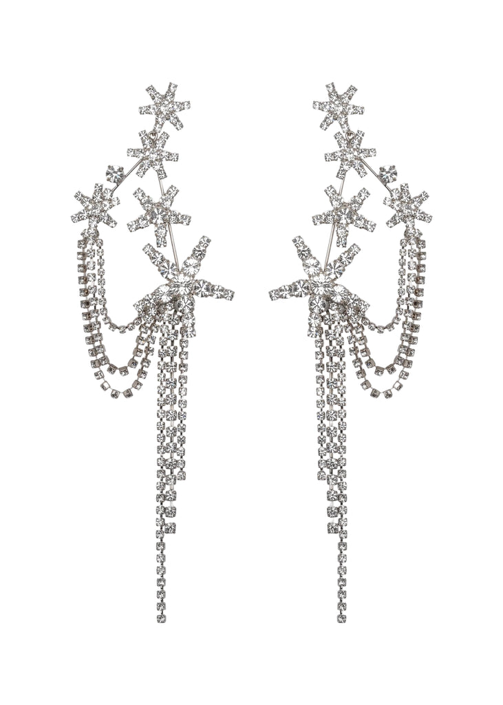 Rhodium-plated brass setting. Fine Austrian crystals arranged in star motifs with cascading crystal fringe. Fine wired construction for lightweight wear. Handmade in New York City.
