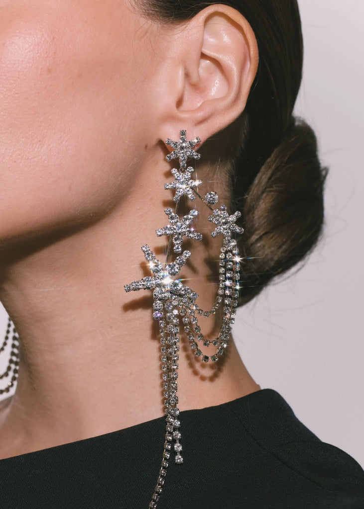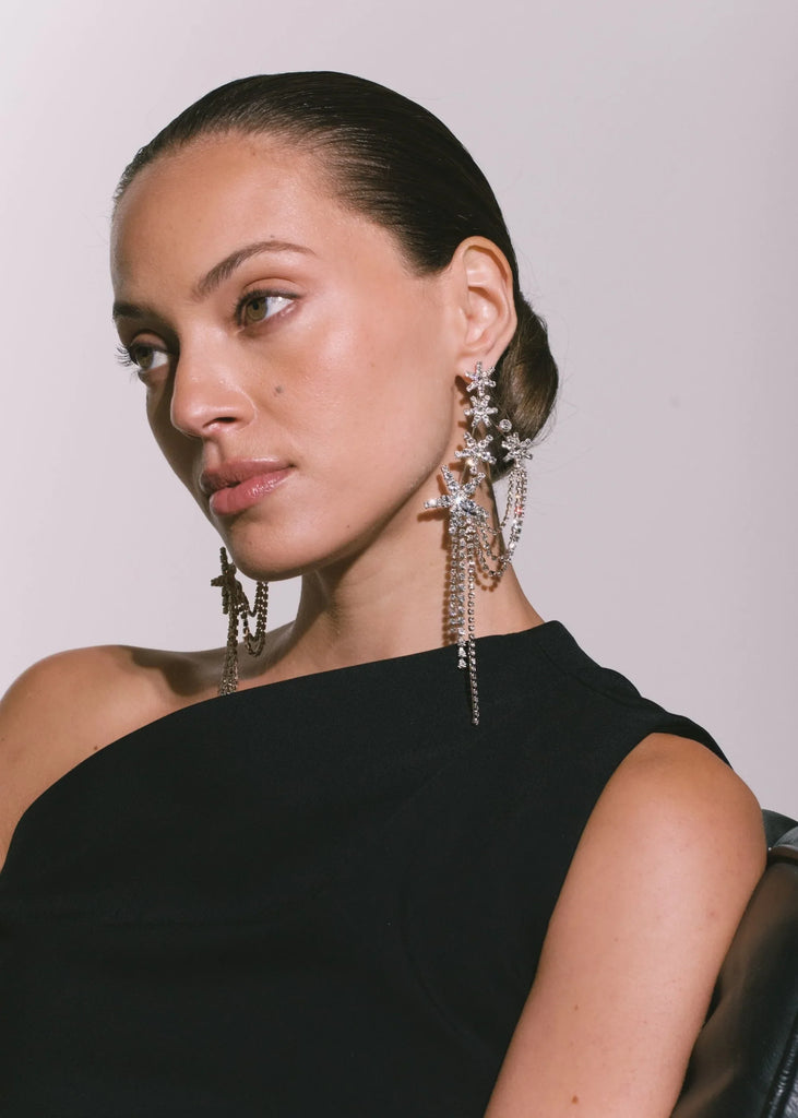 “Everything has a story to tell,” says Jennifer Behr, the founder of her namesake luxury hair accessory brand that has blossomed into one of New York City’s foremost ateliers for jewelry, as well as bridal. In every crystal, pearl, and ribbon, you’ll find the utmost quality and a sense of romance, as each piece reveals a modern interpretation of centuries-old regalia. The Eliana Earrings in Crystal make a celestial statement, featuring a constellation of star motifs draped with shimmering swags of crystal fringe. Handcrafted in New York with Austrian crystals set on fine rhodium-plated wire, this ethereal design creates the illusion of stars suspended in motion, capturing the light with every turn.