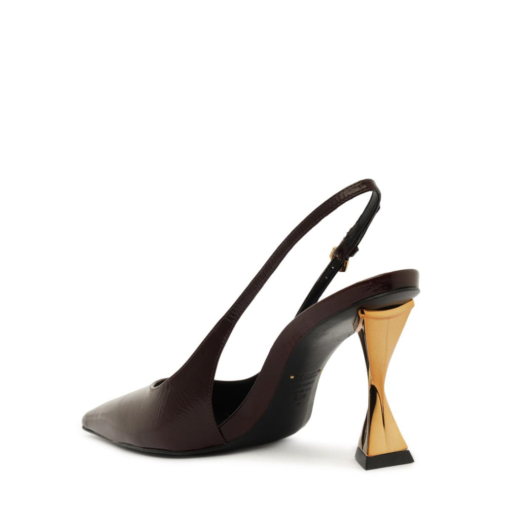 Patent leather upper. Man-made lining. Man-made sole. Pointed toe. Gold stiletto heel.