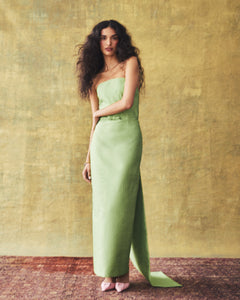 A graduate of the Savannah College of Design, award-winning Alexandra Pijut’s namesake line arrives from her studio in New York, offering luxe ready-to-wear pieces that distinguish themselves between femininity and practicality. The Elizabeth Dress in Leaf Green Brocade features a slim, column silhouette with a detachable train for versatile styling. Its raised herringbone texture adds richness to the vibrant green hue, while bow accents and a corseted bodice lend romantic structure.
