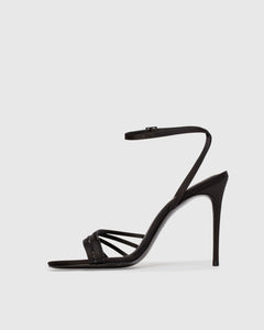 Founded by Kris Avakia in Montréal, Black Suede Studio fuses heritage, passion, and fine craftsmanship to form a line of forward-thinking, luxury footwear. The Ella 100 in Black Satin Embellished is a round toe multi-strap sandal, crafted in satin crepe and finished with crystal embellishments. Set on a high stiletto pin heel, this luminous style offers modern glamour with a bold, statement-making silhouette.