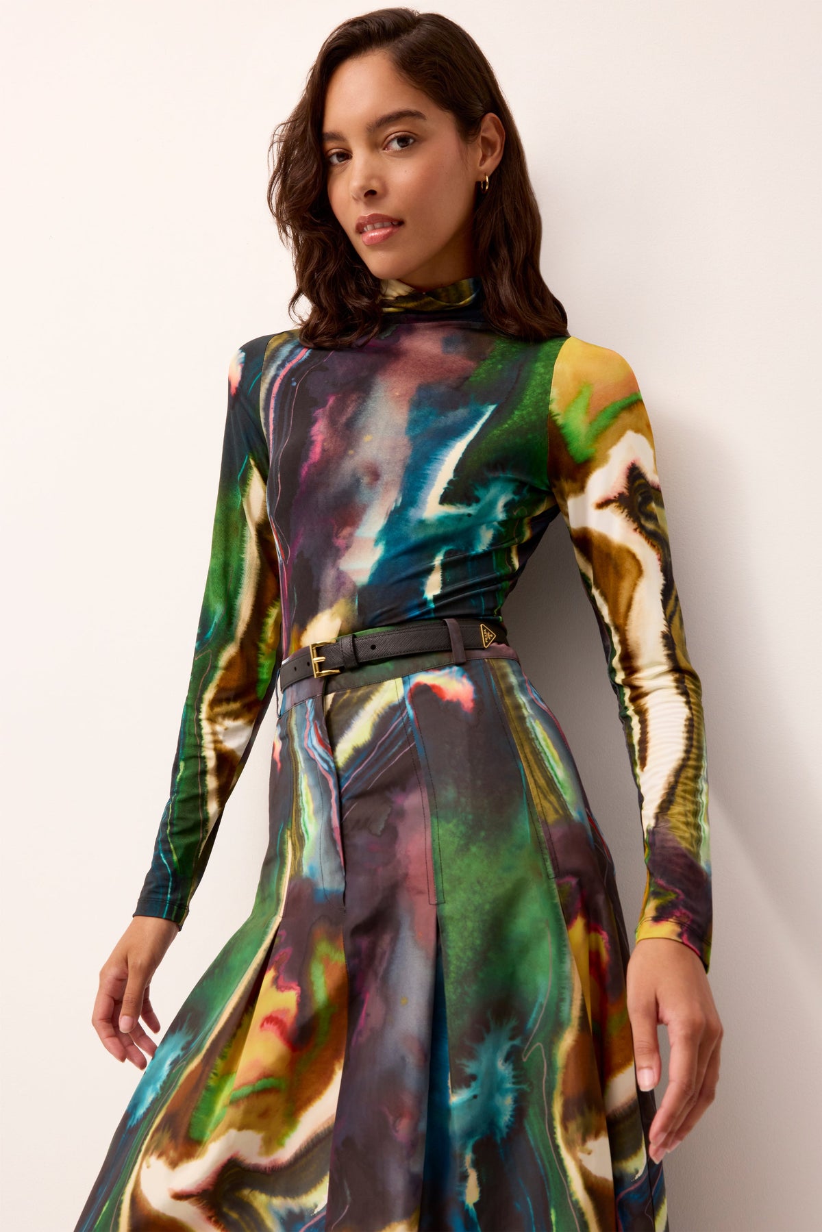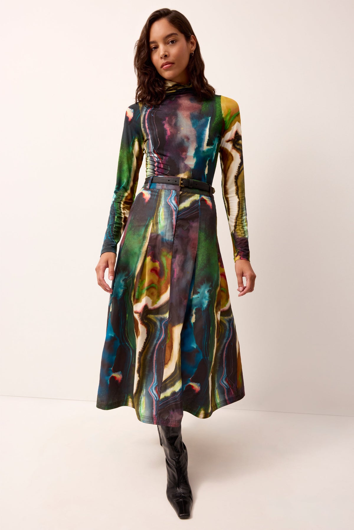 Empowering women through vivid hues and the joy of style, Sarah Doggett Evenson uses her archive of artistic prints, fine fabrics, and flattering silhouettes to make each Marie Oliver piece instantly uplifting. The Eloise Top in Delta is cut from a sumptuous jersey knit and features a figure-skimming silhouette in our striated swirl of moody seasonal color. Pair it with the matching Faith skirt for a coordinated look, or layer it under the sleeveless Violette dress in vegan leather.