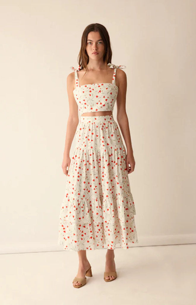 Loulou, founder of Loulou La Dune, extends her refined feminine touch from interior design and tableware into the realm of ready-to-wear fashion. Recognizing the desire for beautifully crafted, effortless, and chic clothing, she has created a capsule collection that integrates elegance and ease into everyday wear. The Elsa Skirt in Red is crafted from flowy, light cotton to give the ultimate comfort and style. This three-tiered design adds just the right amount of volume, giving the skirt a graceful and romantic look. The full-length, flared silhouette makes it a versatile piece that can be effortlessly paired with its various matching tops.