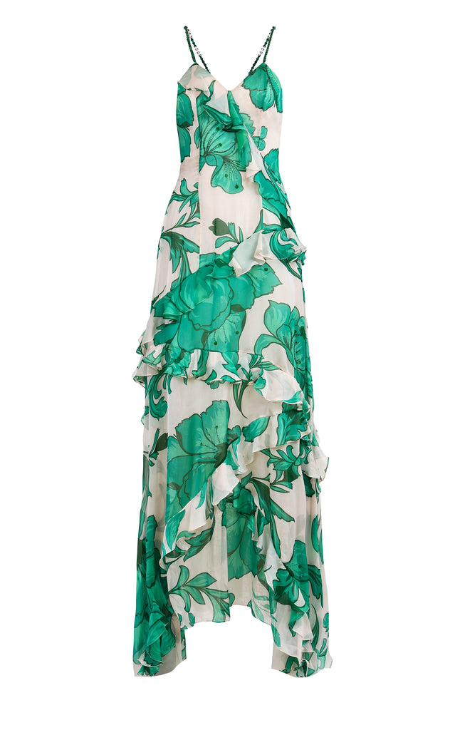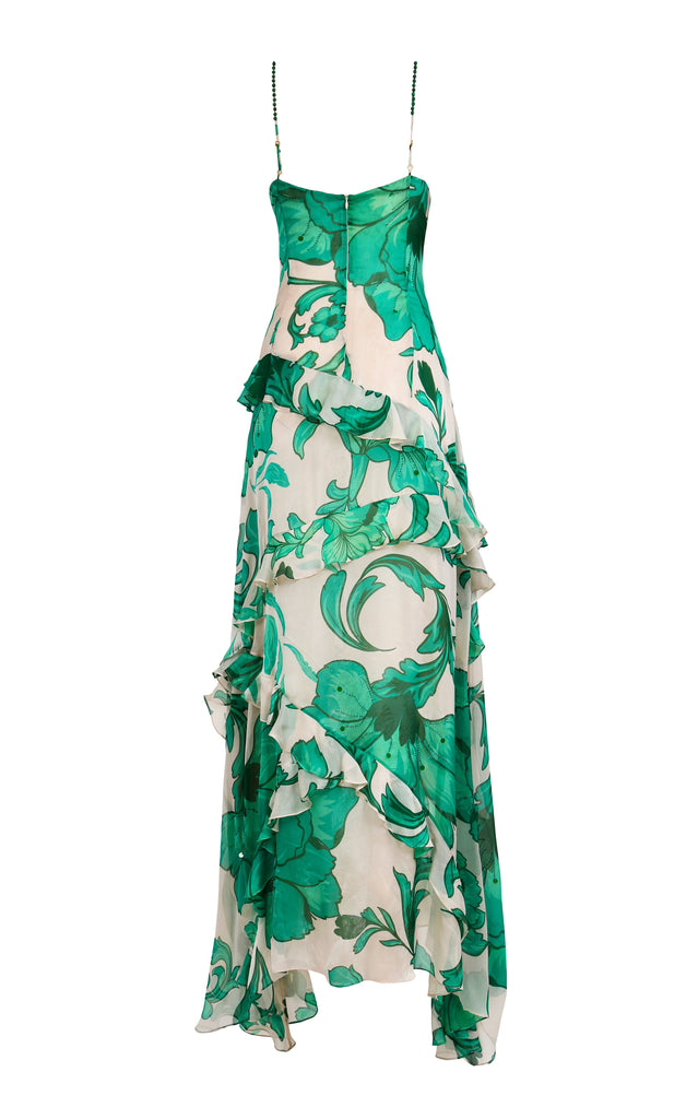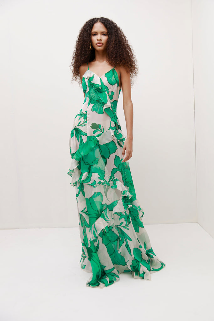 From her atelier in Barranquilla, Colombia, Francesca Miranda combines the diverse, indigenous aesthetic of her surroundings, as well as her own European roots, to produce sumptuous womenswear, bridal, and household objects, each bearing the essential spirit of artistry and craftsmanship. The Elysium Dress captures a sense of effortless romance, defined by softly cascading ruffles and a fluid silhouette. Cut in sheer printed silk with bold florals, it balances graceful movement with a fresh, modern energy.