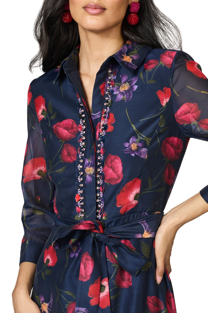 The Embellished Addison Gown in Midnight Jardin balances tailored sophistication with feminine ease. Designed in printed organza, this gown features a shirt-style bodice with a button-down front, three-quarter sleeves, and a self-tie belt that defines the waist. Subtle crystal embellishments lend a hint of shimmer, while soft pleating adds graceful movement—an elegant choice for evening events and refined celebrations alike.