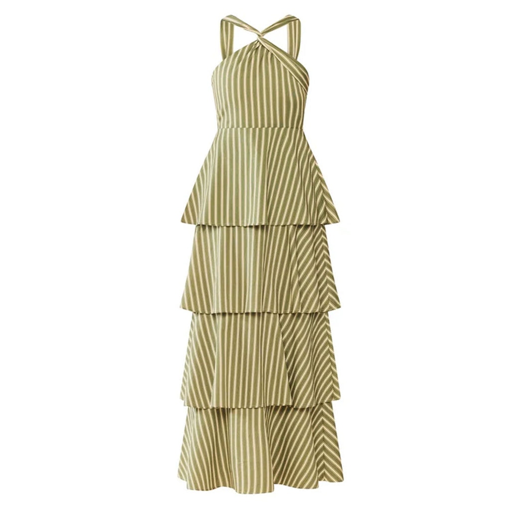 Tomboy looks, girly-girl styles, and an always fashionable approach define Eddy’s aesthetic. With a focus on bold and feminine silhouettes, Eddy dresses and tops pair elevated California bohemian with global inspiration; these are clothes designed to make you feel good inside and out. The Emma Dress in Meadow Stripe is a maxi dress crafted in cotton linen with cross-tie options, offering the option to be worn as a halter neck or one shoulder. Twist both ties for a one-shoulder look or wrap around the neck for a romantic halter neck finished with a tied bow at the back. Refined fit from previous collections with addition of a smocked back for coverage. Dress printed in green and white stripes with hem details.