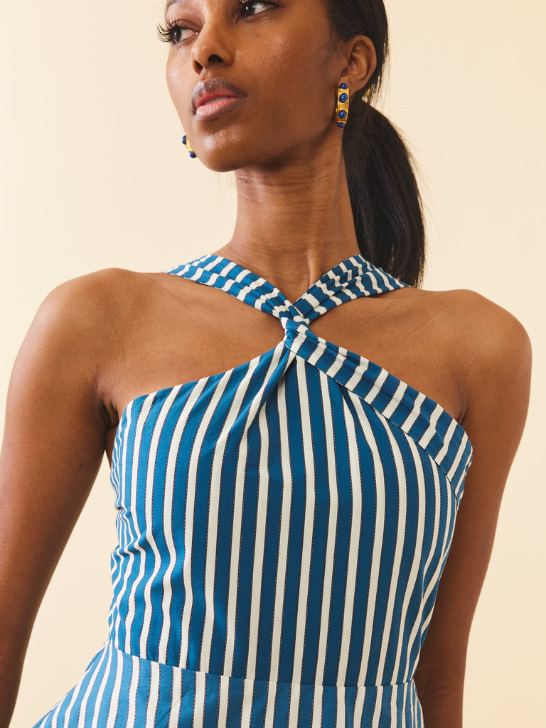 Tomboy looks, girly-girl styles, and an always fashionable approach define Eddy’s aesthetic. With a focus on bold and feminine silhouettes, Eddy dresses and tops pair elevated California bohemian with global inspiration; these are clothes designed to make you feel good inside and out. The Emma Dress in Navy Stripe is a maxi dress crafted in cotton linen with cross-tie options, offering the option to be worn as a halter neck or one shoulder. Twist both ties for a one-shoulder look or wrap around the neck for a romantic halter neck finished with a tied bow at the back. Refined fit from previous collections with addition of a smocked back for coverage. Dress printed in coastal blue and white stripes with bold red hem details.