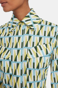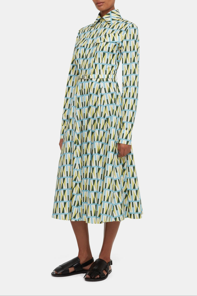 Emilia Wickstead is the epitome of modern femininity. Established in the U.K. in 2008, the ready-to-wear designer is known for impeccable tailoring, bold color, and timeless quality. For Spring Summer 2025 the classic shirt dress has been reimagined in a lightweight and crisp quality of Italian cotton in the form of the Emmalyna Dress. In a geometric motif, this long-sleeved cotton dress is finished with a self-covered belt that accentuates the waist and creates shape and volume through the skirt.