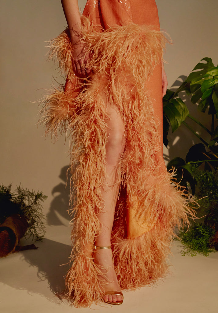 Born in India and raised in New York, where she eventually worked in finance, Natasha Das’ diverse background is at the essence of Danarys New York, a luxury womenswear label that asks its wearer to embrace their strength and fearlessness of their femininity. Crafted in a coral toned fabric, the Emme Dress features an ostrich feather trim, plunging V-neckline, halter straps, and an open back. We cannot get over the drape at the side, and asymmetric ruffle; just stunning.