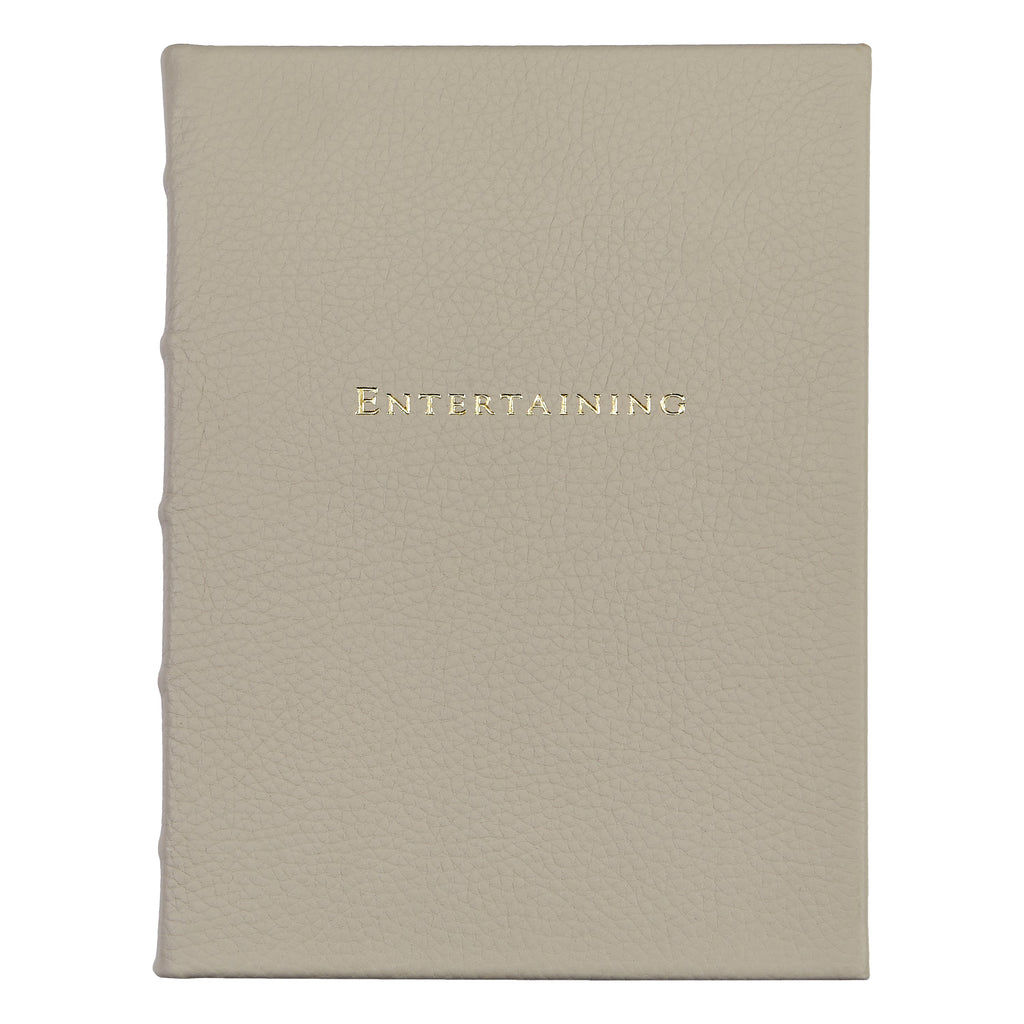 Bound in beechwood pebble grain leather. Includes curated content with menus, tips, and ideas for entertaining. Gold-stamped detailing.