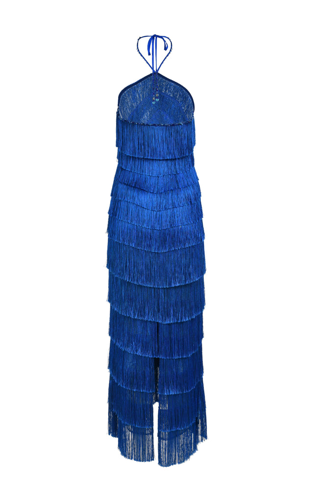 From her atelier in Barranquilla, Colombia, Francesca Miranda combines the diverse, indigenous aesthetic of her surroundings, as well as her own European roots, to produce sumptuous womenswear, bridal, and household objects, each bearing the essential spirit of artistry and craftsmanship. The Estrella Blue Dress is crafted from pleated fringe, bringing dynamic movement to every step through layered textures and an asymmetrical halter neckline. A striking piece, it captivates with its fluid silhouette and bold, sculptural presence.