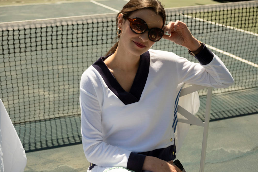 Taking inspiration from vintage tennis fashion, Club & Court employs modern fabrics and silhouettes, as well as a soft palette and bold prints to produce sporting attire, skirts and dresses that accommodate and elevate an active lifestyle. The Farrah Pullover in White with Navy Trim is crafted from soft velour with a flattering, slightly cropped fit. Gold button detailing adds polish, making this an easy layering piece for before or after your match—and just as stylish with jeans or leggings.
