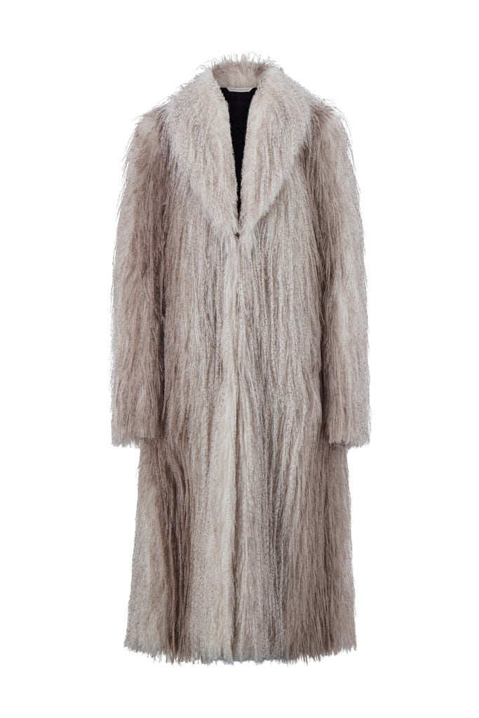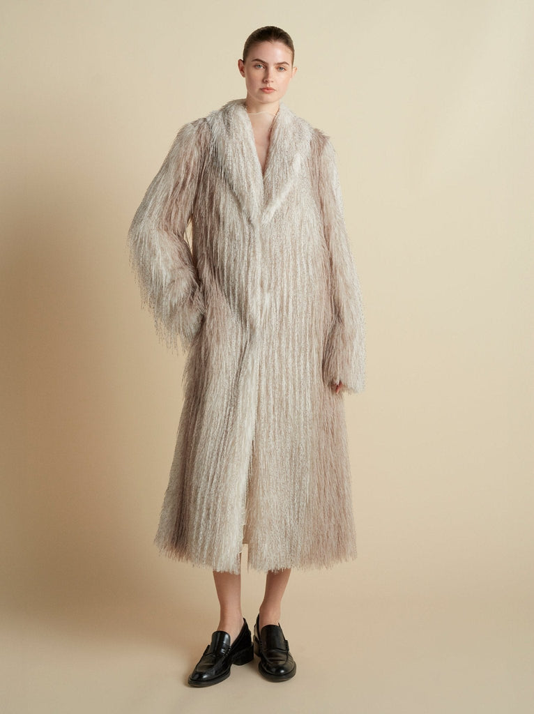 Founded in 2016 by sisters Marina and Francesca Moscone, the label gravitates toward a tactile approach, twisting and draping fabrics by hand to create a softly seductive design using custom jacquards, fil-coupés, and silk wools, all exclusively developed in Italy, rendered in precise shapes and tailoring. The Faux Fur Coat in Ivory Mélange embodies this refined sensibility with a shawl collar, A-line silhouette, and mid-calf length, offering both sculptural volume and softness. A fur hook front closure underscores its polished finish.