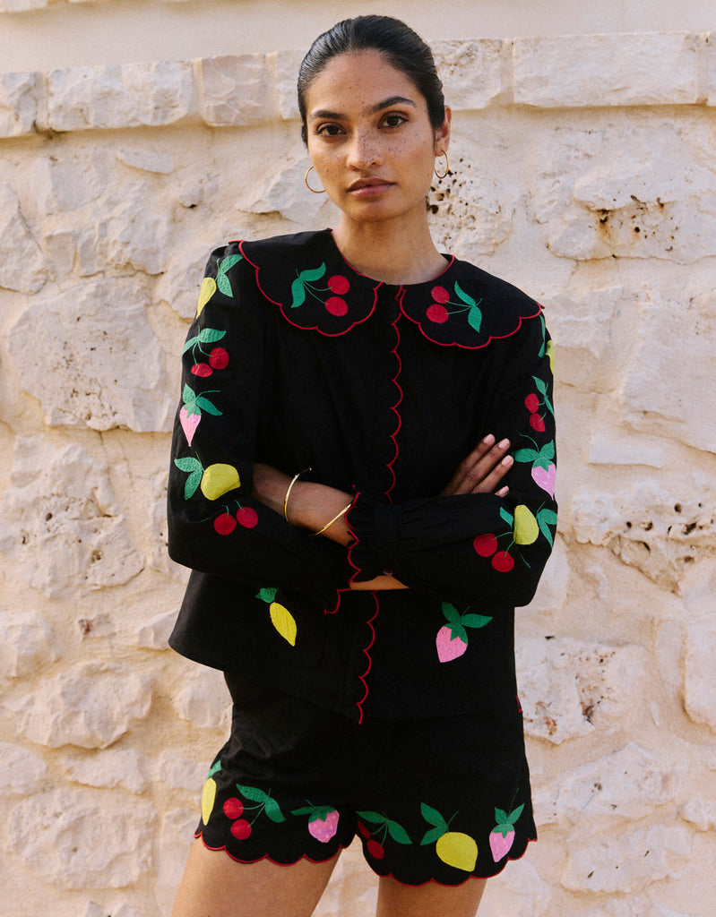 100% cotton. Hand-appliquéd fruit embroidery. Scalloped hems. High-waisted silhouette. Unlined. Made in India.