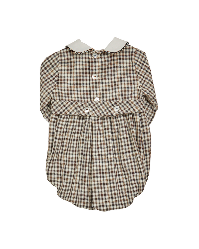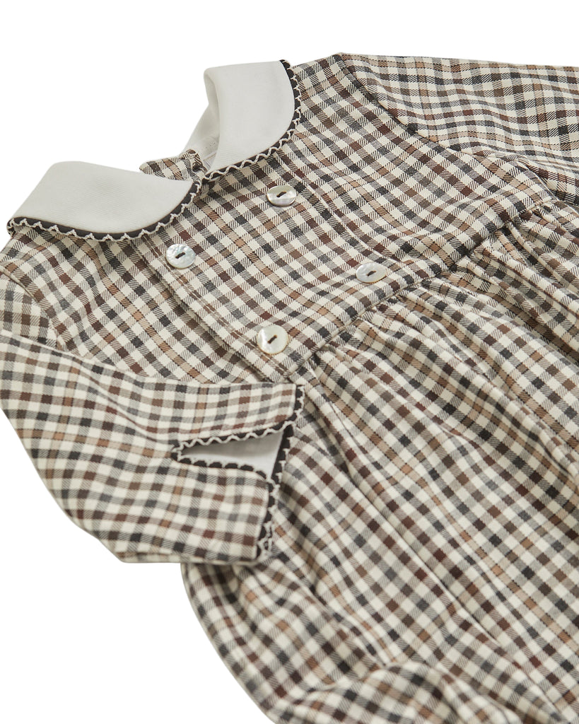 Brown and black check twill. Off-white Peter Pan collar. Double-breasted bodice with pin tuck pleats. Long sleeves with slit cuffs. Elasticated leg cuffs. Attached sash. Snap closures at crotch. Fully lined. Made in Spain.