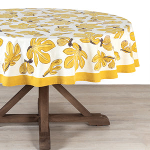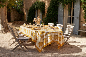 Idyllic landscapes, sumptuous colors, and the vibrant beauty of Southern France describes Couleur Nature. This brand of hand-painted table linens aims to bring a Provençal sense of effortlessness, rich culture, and joie de vivre to your life and home—no matter where you live. With rich, invigorating colors, the Fig Tablecloth in Citrine boasts yellow leaves against an ivory backdrop. This makes an excellent table setting, whether for special occasions or everyday entertaining.