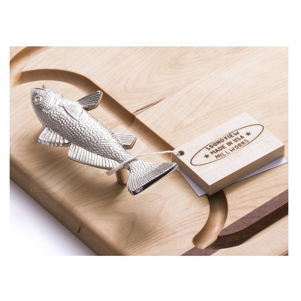 Evoking classic New England style, Soundview Millworks’ handcrafted boards pair solid maple and mahogany with thoughtful details inspired by the nautical world and beyond. Designed to elevate entertaining, each piece offers heirloom-quality craftsmanship with personalized options that make every gathering feel bespoke. The Fish Appetizer Board features a single chrome-plated brass fish handle, recessed juice groove, and softly rounded corners—making it a functional and refined piece for serving cheeses, appetizers, or small bites.