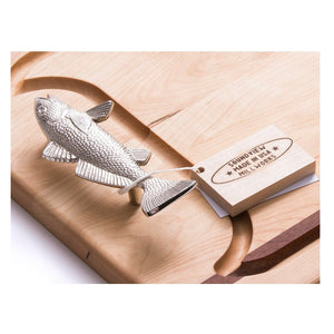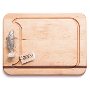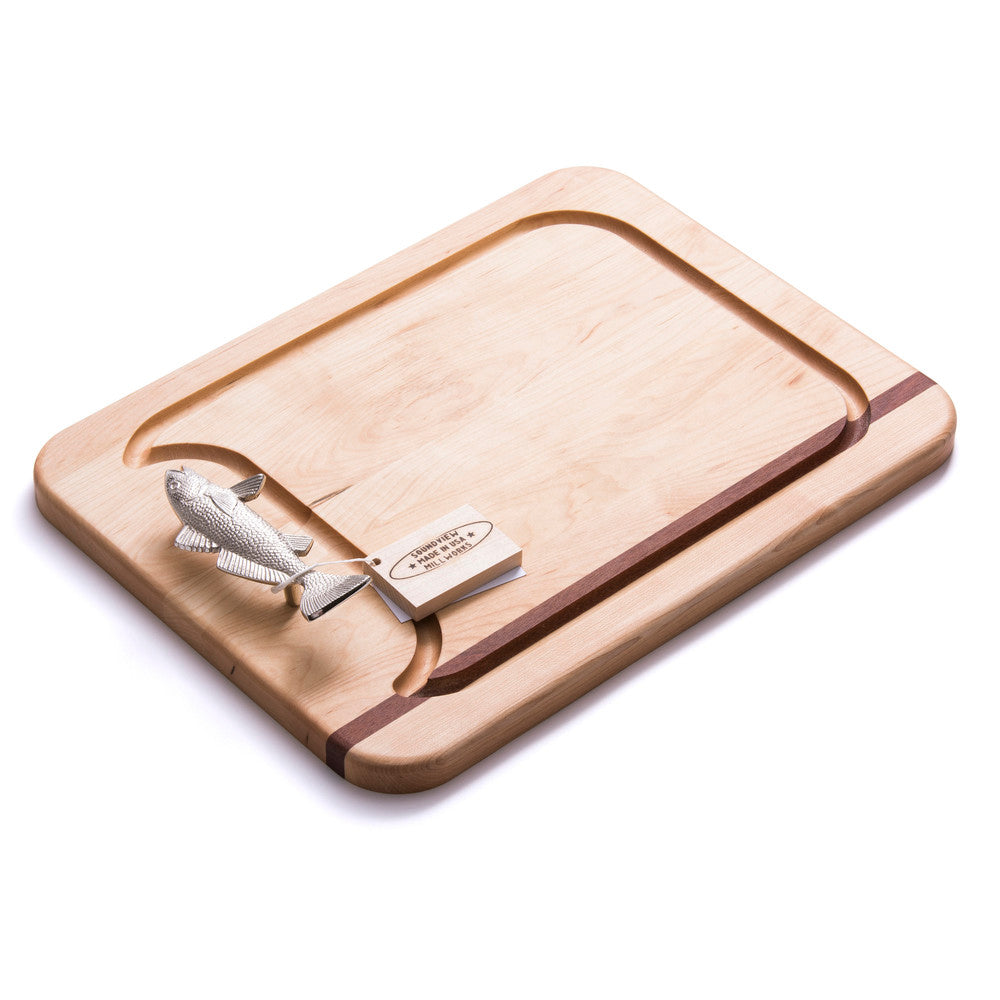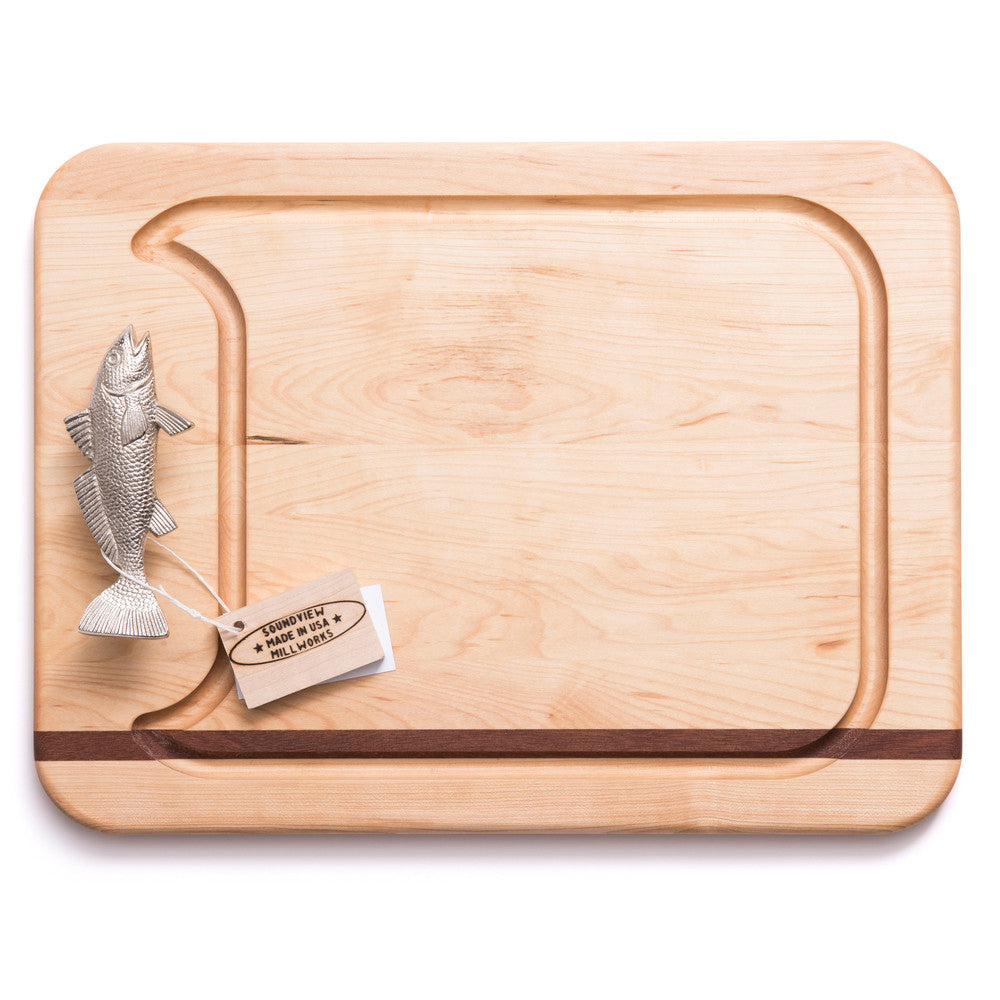 Solid maple with mahogany detailing. Chrome-plated brass fish handle. Recessed juice groove. Rounded corners. Handcrafted in the USA. Personalization available.