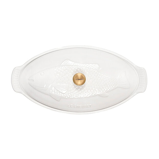 Recognized for its strength and durability, as well as its beauty and quality, Le Creuset produced the first enameled cast iron cookware nearly a century ago. A tradition of maintaining the finest culinary craftsmanship, combined with the latest innovations, means Le Creuset is known for blending classic form with real function and that it's made for home cooks and professional chefs alike. The Fish Baker features a covered oval baking dish embossed with an elegant fish motif and brushed gold knob. Ideal not only for baking, roasting, steaming, and broiling all manner of fish recipes, it's also an elegant solution for roasting and steaming vegetables and meat, bubbling casseroles, one dish meals and more.