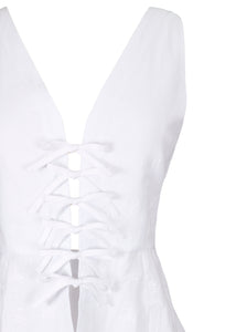 The name Fanm Mon is taken from a Haitian phrase meaning “mountain woman,” reflecting both the founder’s heritage and the spirit of their clothing. Nature’s bounty, fairytale silhouettes, and exploration come together in dresses of outstanding quality, which hold a classic place, yet defy expectations. Cut in airy linen, the Flamen set includes a sleeveless top, with front attachments, as well as a flowy skirt with a ruffled hem, cut on the bias. Good for lunch, tea, a garden party, or the dance floor; we cannot get enough of this fun, flirty set.