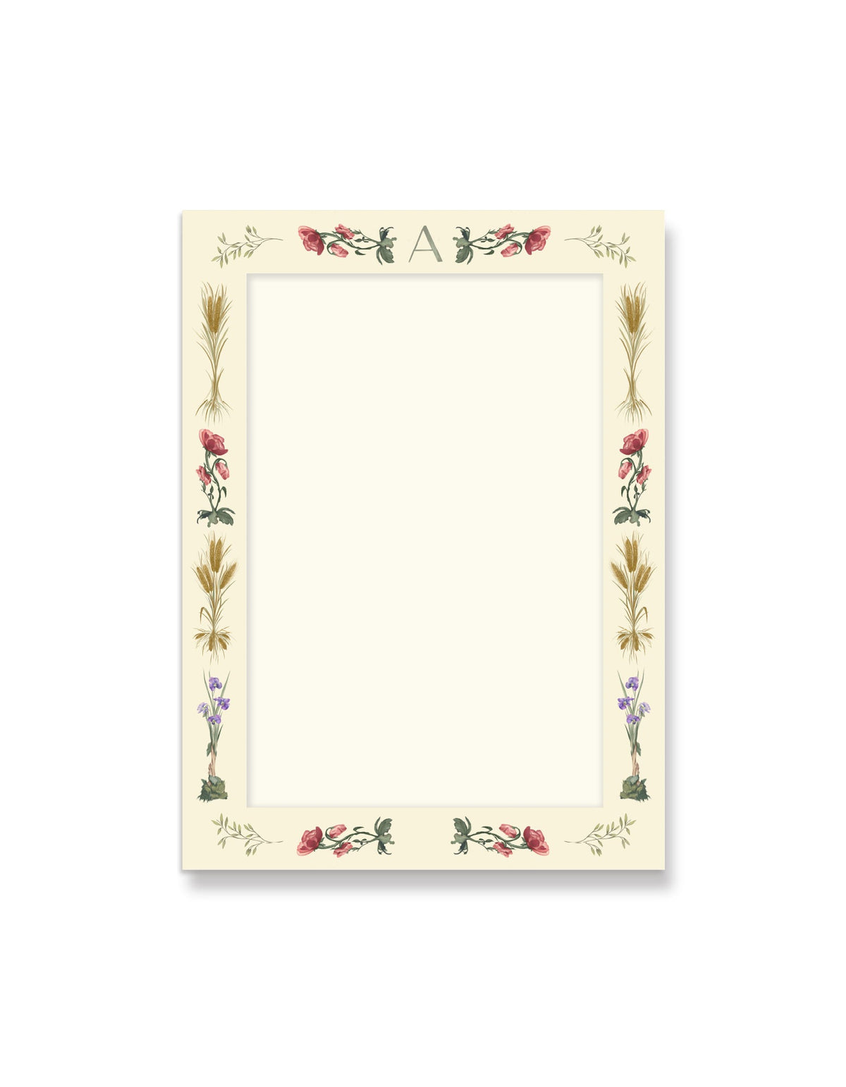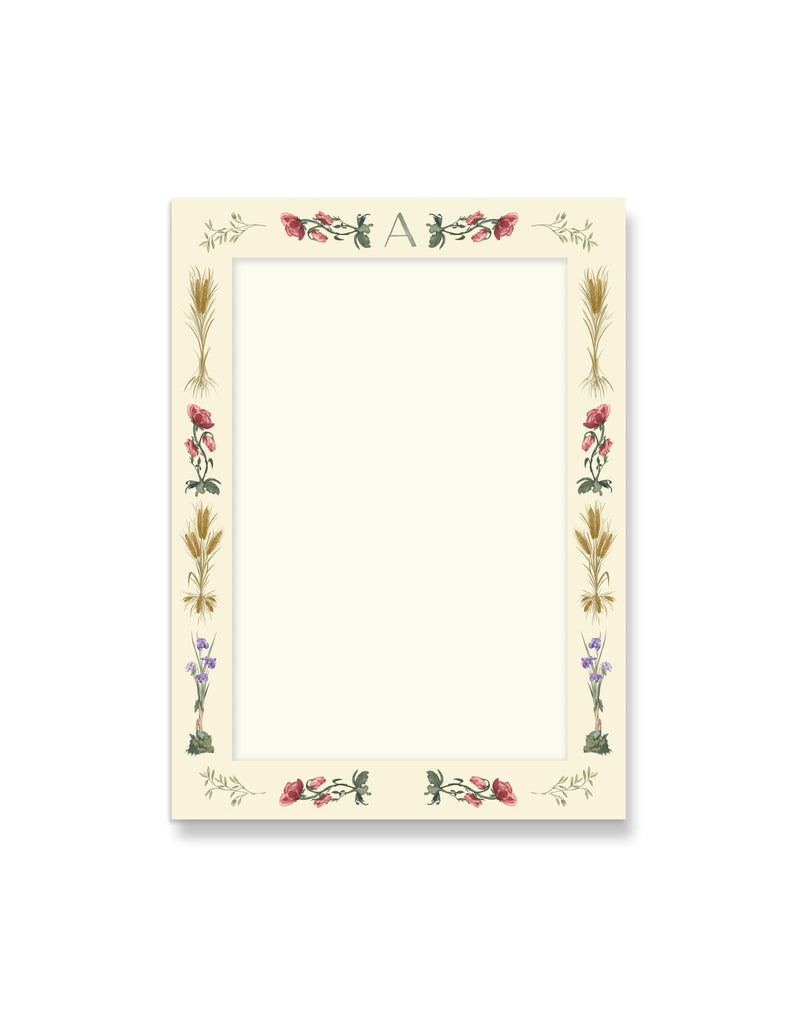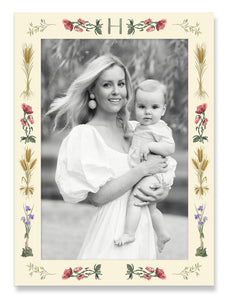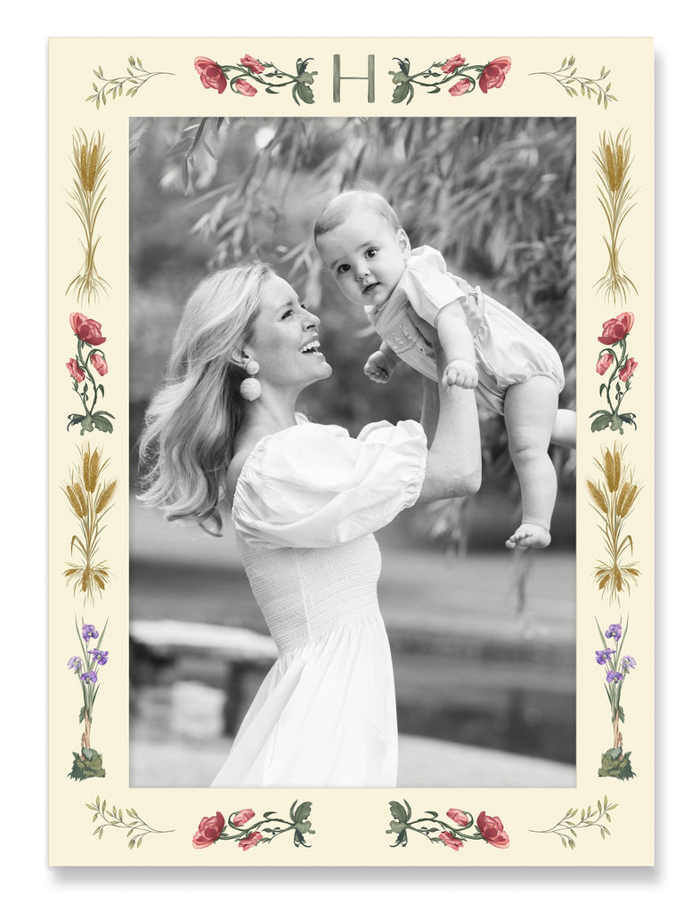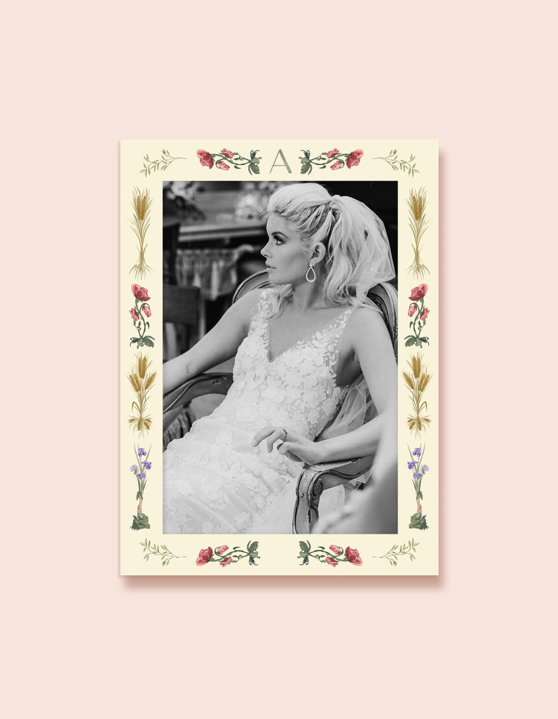 Dreamed up to encapsulate your most cherished matrimony moment, and available exclusively at Over The Moon, Fleur’s Toujours Tabeltop frame helps to hold the day’s sentiments dear. Created with the time-honored tradition of handcrafting, the frame features carved details, and a print on wood of painted flourishes, to last a lifetime. The ornate border borrows from late 19th century French interior frescoes, while each adorning element was chosen for its symbolism: The rose reveals love, the iris hints at courage, and fertility is represented by wheat. Choose any initial to personalize the piece with your married name or first name. Frame may be ordered without a letter as well.