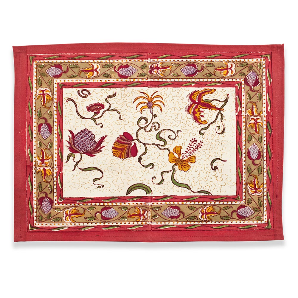Idyllic landscapes, sumptuous colors, and the vibrant beauty of Southern France describes Couleur Nature. This brand of hand-painted table linens aims to bring a Provençal sense of effortlessness, rich culture, and joie de vivre to your life and home—no matter where you live. With its curling vines and flowers, the rich harvest tones of the Fleur des Indes Mats, Set of 6 are exotic and sophisticated. Combining Eastern motifs with classic French styling, these table linens, runners and are ideal for formal or festive events. Fine French table linens, hand-printed, these table placemats are a great way to refresh your table, adding color and vibrancy to every day or formal settings.