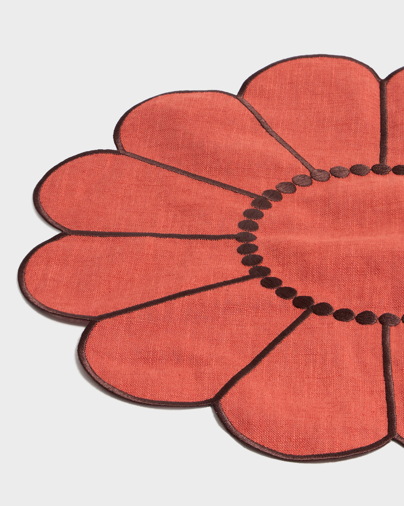 Inspired by the pages of Cabana—a magazine for a new generation of globetrotters—Casa Cabana’s homewares both explore and expand the worlds we share with our interiors. The Floral Embroidered Placemat in Terracotta is crafted from a soft linen blend in a warm terracotta hue, shaped into a delicate bloom. Finished with scalloped edges and intricate embroidery, it brings a refined, artisanal touch to any table setting.