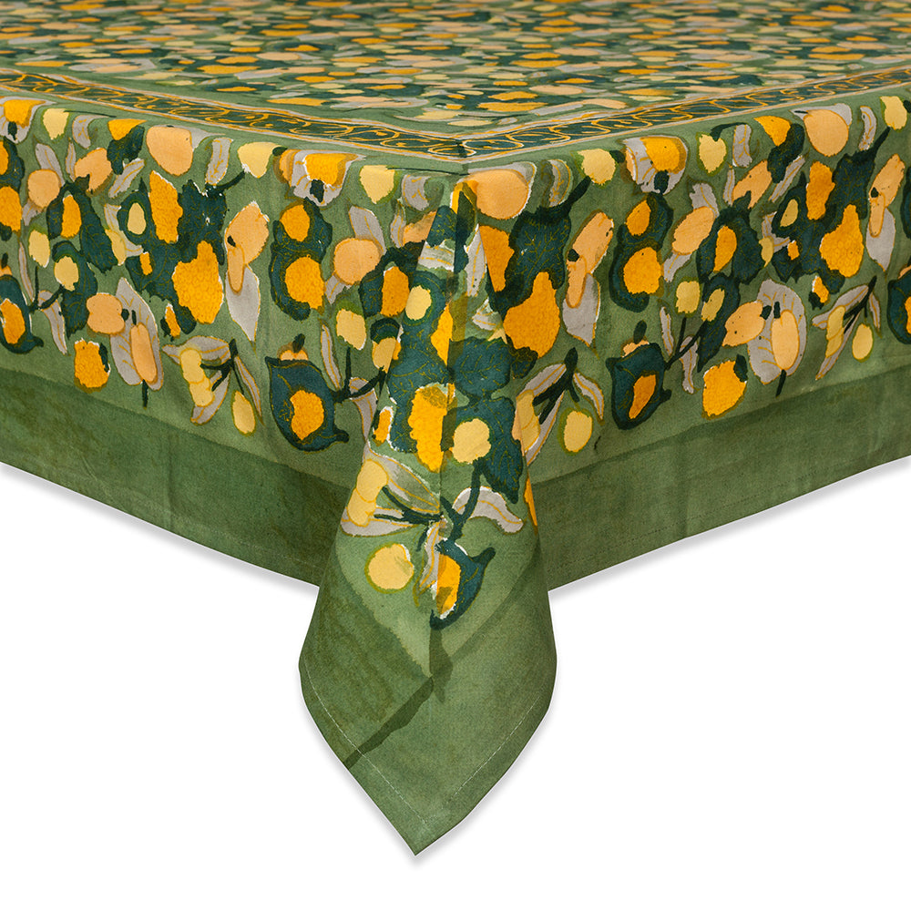 Idyllic landscapes, sumptuous colors, and the vibrant beauty of Southern France describes Couleur Nature. This brand of hand-painted table linens aims to bring a Provençal sense of effortlessness, rich culture, and joie de vivre to your life and home—no matter where you live. The French Tablecloth Fruit in Yellow and Green features a cheerful zest of color. Impressionistic and bright, this high-quality piece is a must-have for dine-in memories. An elegant addition to any tablescape.