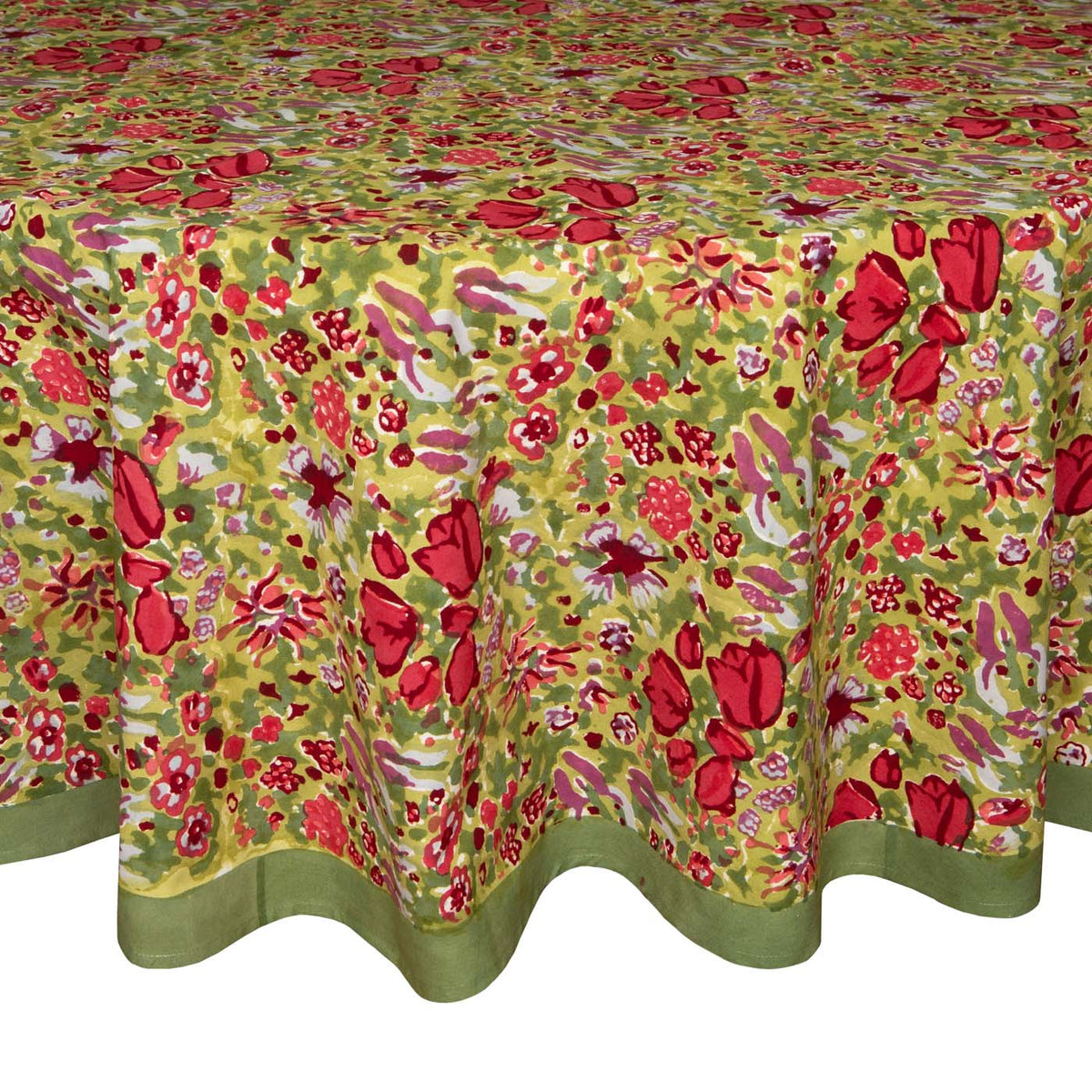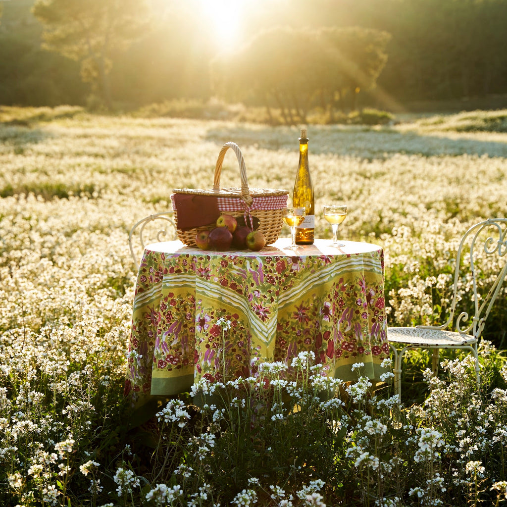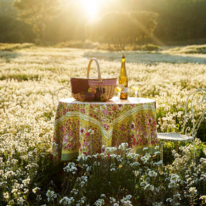 Idyllic landscapes, sumptuous colors, and the vibrant beauty of Southern France describes Couleur Nature. This brand of hand-painted table linens aims to bring a Provençal sense of effortlessness, rich culture, and joie de vivre to your life and home—no matter where you live. The French Tablecloth Jardin in Red and Green features a luxuriant, loosely tended design inspired by a garden. Verdant and lush, this high-quality piece is a must-have for dine-in memories. An elegant addition to any tablescape.