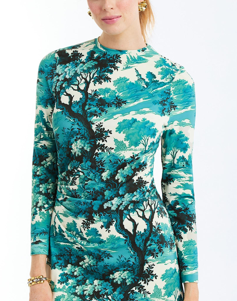 The Gabriella Midi Dress in Turquoise Ceramic Toile embodies understated elegance for day-to-evening wear. Crafted in soft printed stretch jersey, this body-skimming silhouette features gentle ruching at the waist for a flattering fit that moves with ease. With its refined crew neckline and long fitted sleeves, it offers an effortless polish—ideal for luncheons, daytime celebrations, or desk-to-dinner occasions.