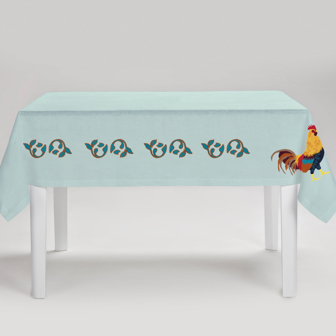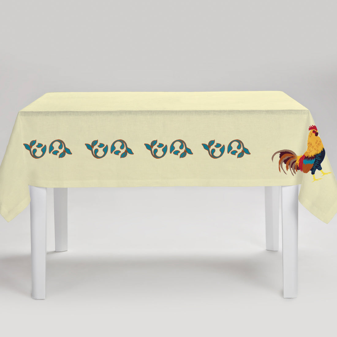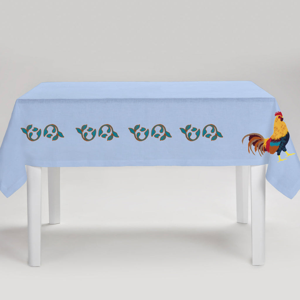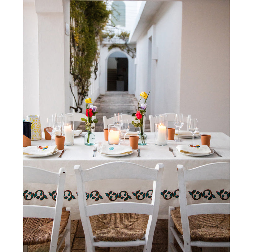Cibelle embroiders the olive trees, vineyards, lemons, patterns and gardens of Puglia’s countryside to tell the stories of its landscapes and people through their table linens. Using 100% Italian linen and gorgeous embroideries, hand-crafted at every step, each Cibelle piece speaks to its founder Raffaella Gemiti’s mission to combine the craft, culture, and natural beauty of her homeland in unsurpassed table settings. Evoking the rooster, a symbol of prosperity and luxury in the Apulian culture, the Gallo Tablecloth is an elegant, colorful addition to any tabletop, and pairs back to the Gallo placemat and napkins for a matching set.