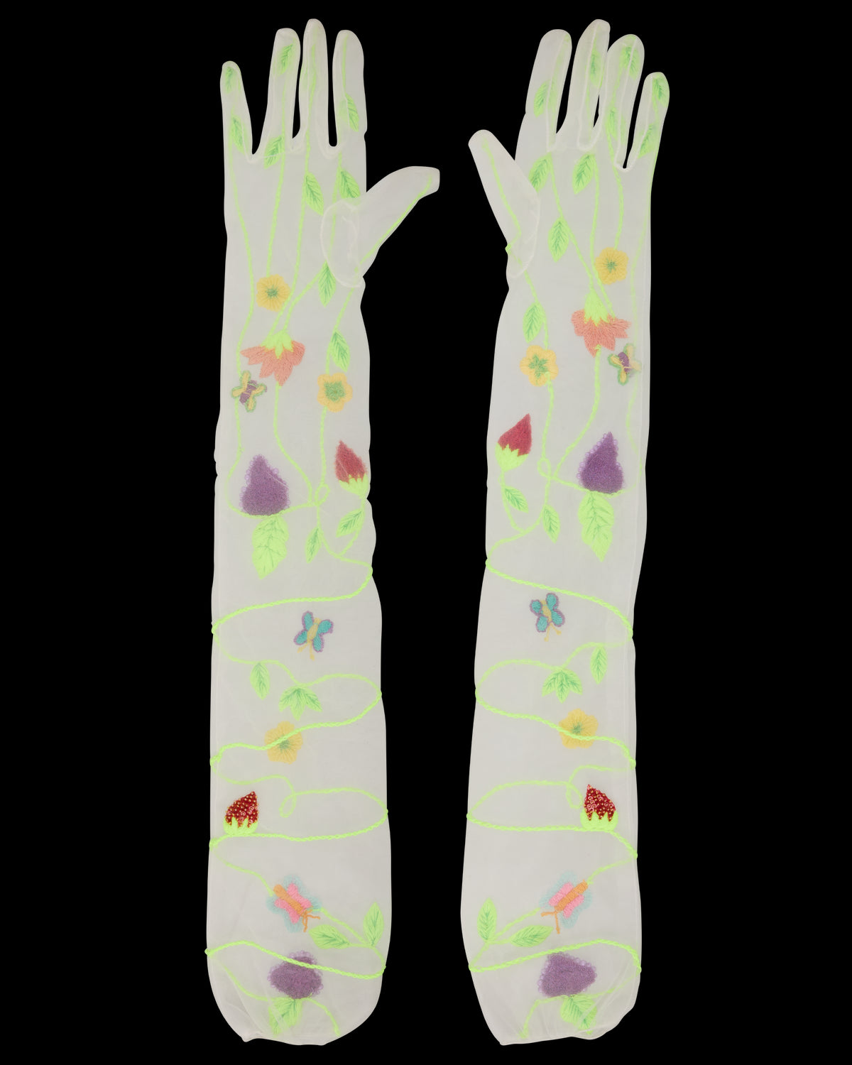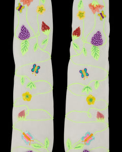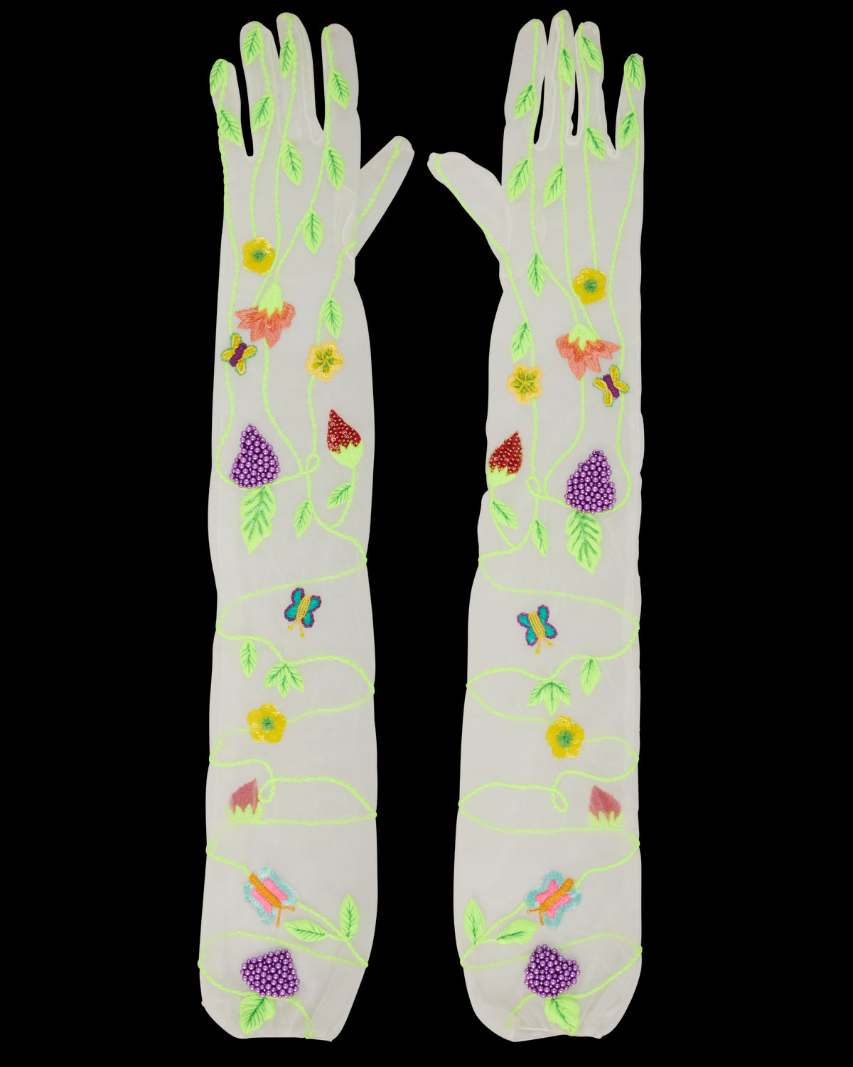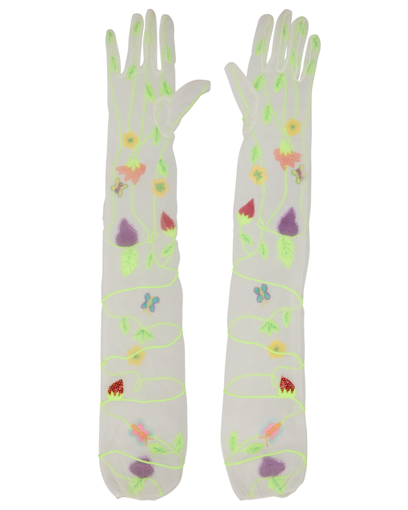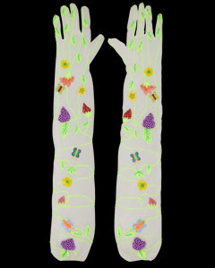 An Instagram and celebrity-favorite, Susan Alexandra’s carefully designed pieces bring whimsy to another level, and another world. Enter a youthful landscape of candy-colored jewelry, brightly beaded bags, as joy, fun, and fashion shine forth from every piece, and pop of color. Here, a fervent garden, replete with blossoms, grapes, strawberries, and verdant vines, is embroidered onto the chic, beaded Garden Gloves.