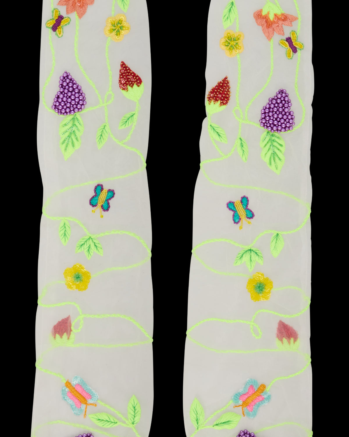 Hand-embroidered tulle with pearl and sequin accents.