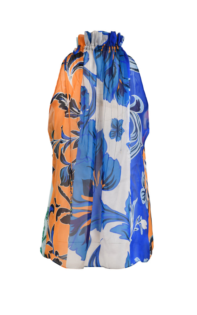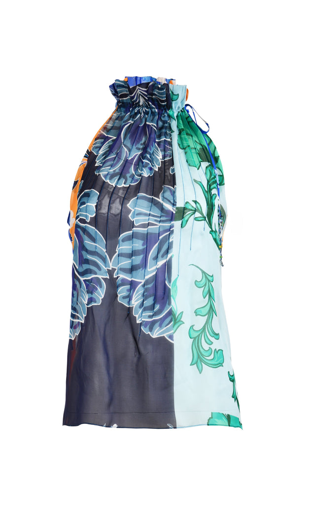 From her atelier in Barranquilla, Colombia, Francesca Miranda combines the diverse, indigenous aesthetic of her surroundings, as well as her own European roots, to produce sumptuous womenswear, bridal, and household objects, each bearing the essential spirit of artistry and craftsmanship. The Garden Top is a halter-neck design in printed silk chiffon, defined by its soft draping and fluid silhouette. With its bold pattern and airy construction, this piece transitions effortlessly from day to night with timeless sophistication.