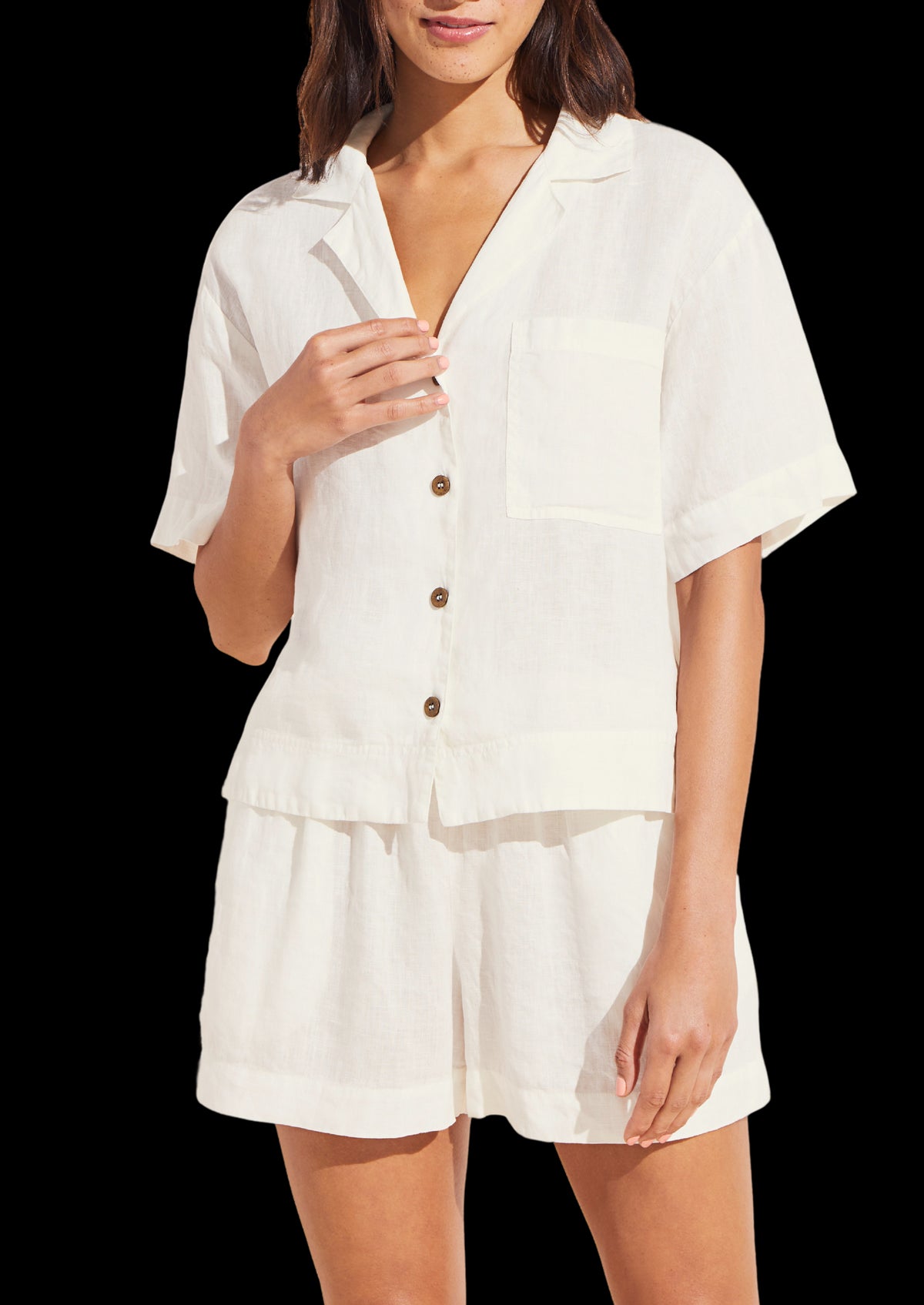 100% linen. Relaxed short sleeve camp shirt and short set. Button down top with notch collar and functional chest pocket. Back yoke with inverted box pleat. Mid-rise relaxed short with elastic waistband. Side seam pockets. Back patch pocket. Side seam slits.