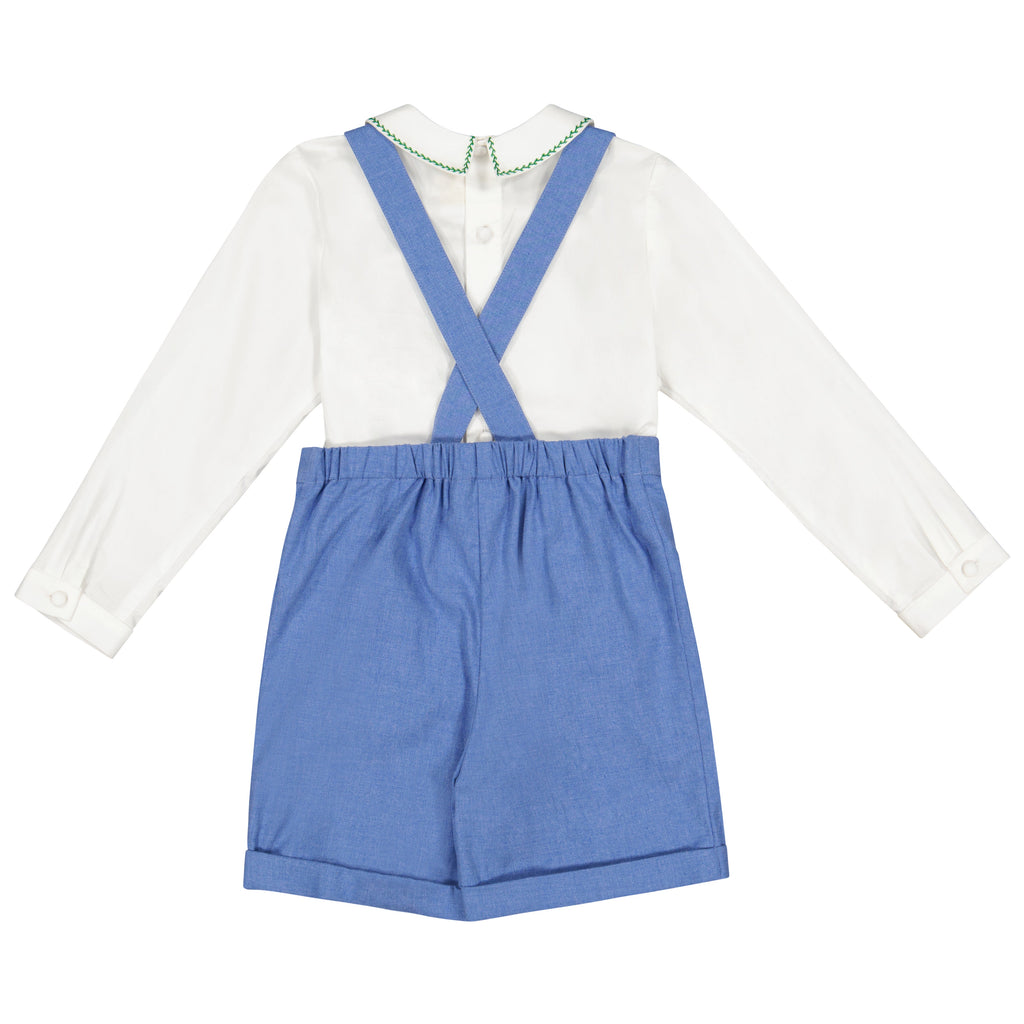 100% cotton twill with double layer. Blue flannel hand-smocked dungarees with white snowflake and red and green geometric embroidery. Adjustable braces (wear straight or crossed). Elasticated waist and covered back buttons. Includes a white long-sleeve cotton shirt with green-embroidered Peter Pan collar. Available in a grey variant. Coordinates with Heidi Bubbles and Heidi Smocked Dresses for sibling holiday looks.